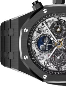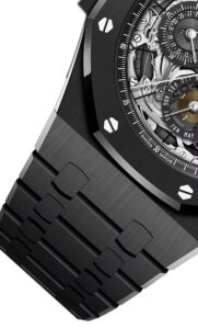 このモデルは、44mmのホワイトセラミックケースとブレスレットを採用し、軽量でありながら高い耐傷性を誇ります。サファイアクリスタル製のスケルトンダイヤルからは、複雑なムーブメントの動きを鑑賞できます。ホワイトゴールド製のロイヤルオーク針には蓄光塗料が施され、視認性も確保されています。このモデルは、2023年に1本限定で製造された特別なタイムピースです。