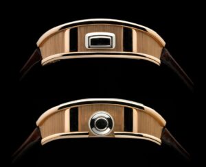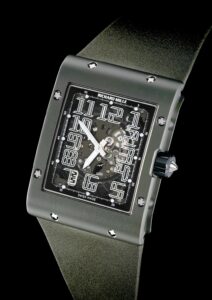 RM016はリシャール・ミルでは珍しい長方形フォルムで、2007年に初登場。49.8×38mm、厚さ8.25mm(チタンモデル)と非常にスリムで、シャツの袖口に収まりやすく、スタイリッシュな印象を与えます。