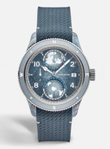 2025年新作「ゼロオキシジェン マウントヴィンソン」は、南極の厳しい自然と氷河を想起させるブルーグリーンの配色と氷の質感を再現したダイヤルが印象的です。複合素材製ケースは、クォーツ繊維やレジンなどを融合し、軽量かつ堅牢。ケース径は43.5mmと存在感がありながら、軽快な装着感を実現しています。