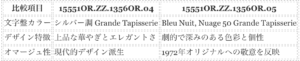 両者の違いは主に 文字盤のカラーと表現する雰囲気の差にあります。銀はクラシカルで静かな輝き、青は存在感があり時代を超えた魅力を放ちます。