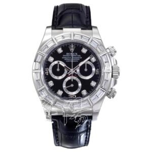 116589BRも18Kホワイトゴールド製の40mmケースを採用していますが、ベゼルにはバゲットカットのダイヤモンドがセットされています。このデザインは、よりクラシカルで上品な印象を与えます。製造年は2000年代初頭からで、現在では希少なモデルとなっています。