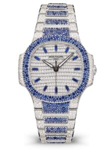 7118/1451G-001は、ホワイトゴールドのケースとブレスレットに、1,500個のブリリアントカットダイヤモンド(計6.53カラット)と876個のブルーサファイア(計6.58カラット)をスノーセッティング技法で配置したモデルです。ダイヤモンドとサファイアの組み合わせが、ノーチラスの特徴的なデザインを際立たせ、洗練された美しさを演出します。ダイヤルには波模様のパターンが施され、12個のブルーサファイアがインデックスとして輝きます。ムーブメントには自動巻きキャリバー26-330 Sを搭載し、シースルーのサファイアケースバックからその精緻な動きを鑑賞できます。防水性能は30mで、日常使いにも適しています。