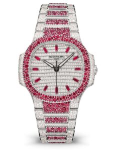 7118/1452G-001は、ホワイトゴールドのケースとブレスレットに、1,500個のブリリアントカットダイヤモンド(計6.53カラット)と876個のルビー(計6.58カラット)をスノーセッティング技法で配置したモデルです。ダイヤモンドとルビーのコントラストが、情熱的で華やかな印象を与えます。ダイヤルには波模様のパターンが施され、12個のルビーがインデックスとして輝きます。ムーブメントには自動巻きキャリバー26-330 Sを搭載し、シースルーのサファイアケースバックからその精緻な動きを鑑賞できます。防水性能は30mで、日常使いにも適しています。