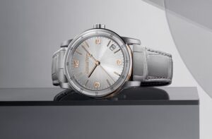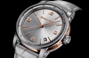 このモデルは、18Kピンクゴールドのケースに、グレーのラッカー仕上げのダイヤルを組み合わせています。ダイヤルにはサンレイパターンが施され、ピンクゴールドのアプライドアワーマーカーと針が配置されています。グレーのラッカー仕上げのインナーベゼルと、手縫いのグレーアリゲーターストラップが、洗練された印象を与えます。