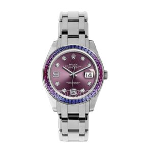 86349SAFUBLはホワイトゴールド製で、ベゼルにバゲットカット・サファイアを装備。文字盤カラーは“Red Grape”(レッドグレープ)と呼ばれる深い赤調。ホワイトゴールドブレスレットとダイヤルマーカーが調和する上品な造りです。