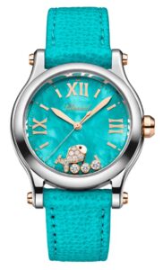 ショパール Ref.278598‑6001は、ブランドの「高級ジュエリーと時計製造の融合」を体現した夏らしいアーティスティックな逸品です。ルーセント スティール™による硬さと輝き、海を感じさせる色彩美、自由に泳ぐ魚とダイヤの遊び心が合わさり、「Happy Sport」精神を継承しながら新たな表現へと昇華しています。数量限定のため、コレクターズアイテムとしても注目されるモデルです。