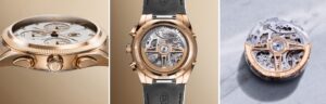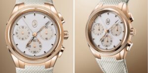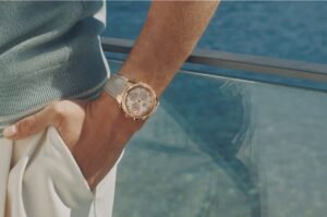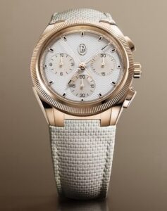 この新作は18Kローズゴールドケース(42mm×12.9mm)に、ブランドを象徴する三角突起のギョーシェ「クラウ・トリアンギュレ」文字盤を採用。サンドストーンと呼ばれるサブダイヤルのカラーリングは、地中海の砂浜を彷彿とさせる温かみが魅力です。
