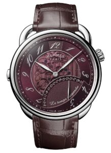 新作の「アルソー タンシュスポンデュ」は、エルメスの伝統的なデザイン要素と現代的な美学が融合しています。非対称のラグや、馬具から着想を得たケースデザインはそのままに、スケルトン仕様の文字盤が新たな魅力を加えています。文字盤のカラーは、深みのあるサンバーストブルー、温かみのあるブランデゼール、情熱的なルージュセリエの3色が用意されており、どれもエレガントな印象を与えます。