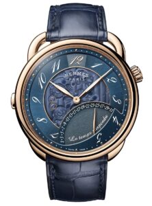 「アルソー タンシュスポンデュ」は、2011年にエルメスが発表した独自のコンプリケーションウォッチです。フランス語で「時を停止する」を意味するこのモデルは、ボタン操作で時針と分針が12時付近に移動し、時間表示が停止したように見えるユニークな機構を備えています。しかし、内部のムーブメントは動き続けており、再度ボタンを押すと正確な時刻に戻る仕組みです。この遊び心あふれる機能は、時間に縛られない自由な感覚を象徴しています。