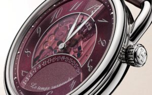 2025年の新作「アルソー タンシュスポンデュ」は、従来のデザインを一新し、スケルトン仕様の文字盤を採用しています。これにより、ムーブメントの精緻な動きを視覚的に楽しむことが可能となりました。ケースサイズは42mmで、18Kホワイトゴールドまたはピンクゴールドが選択できます。また、文字盤のカラーはサンバーストブルー、ブランデゼール(砂漠の茶)、ルージュセリエ(鞍の赤)の3色展開で、それぞれに独自の魅力があります。