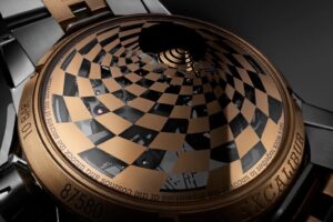 Dr. Wooのフィンライン・ドットワークのアイコンともいえる“スパイダー(クモ)”が10時位置に黒インクで刻印され、9時にはピンクゴールドのネビュラ(星雲)、10~11時間にはブラックホールを象徴するらせんモチーフが配置。
