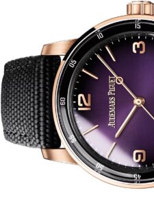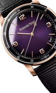 このモデルは、スモークラッカー仕上げのパープルダイヤルが特徴です。光の角度によって表情を変えるダイヤルは、深みと高級感を演出します。18Kピンクゴールドのケースとの組み合わせが、エレガントで洗練された印象を与えます。