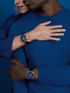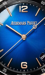 このモデルは、スモークラッカー仕上げのブルーダイヤルが特徴です。深みのあるブルーは、落ち着きと知性を感じさせ、18Kピンクゴールドのケースとのコントラストが美しいバランスを生み出しています。