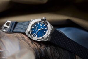 4600V/200A-B980は、ステンレスブレスレット(マルタ十字モチーフ)、ブルーカーフレザー、ブルーラバーの3種を付属し着せ替え可能な構造 。