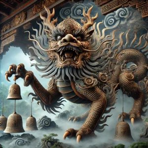 そして、この鐘に関係する伝説として知られているのが「蒲牢(ほろう)」という神獣です。 蒲牢は中国の伝説に登場する竜の種類で、非常に大きな声で吠えることから、鐘の音をより響かせる象徴として、鐘の頂部に蒲牢の像が飾られるようになりました。