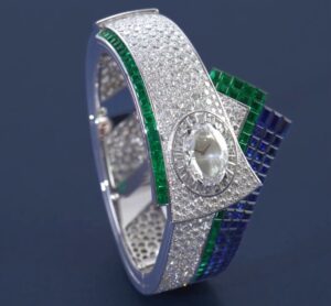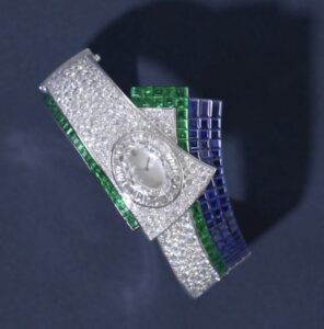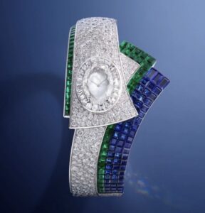 「リュバン ミステリユー」は、18Kホワイトゴールドとローズゴールドを基調とした繊細な構造が魅力です。リボンの部分にはサファイアやエメラルドが贅沢に配置され、さらにスノーセッティングのダイヤモンドがリュクスな輝きを加えています。曲線美を重視したデザインは、まるで本物のリボンが結ばれているかのような自然な動きを表現。ジュエリーとしての華やかさと、時計としての機能性を見事に両立しています。