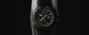 ブラックDLCコーティングを施したグレード2チタン製の44mmケースを採用し、軽量かつ耐久性に優れています。ブラックオパーリンダイヤルにライムグリーンのアクセントが映え、スポーティでモダンな印象を与えます。ラバーストラップもブラックとライムグリーンのバイカラーで、全体のデザインと調和しています。