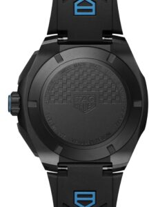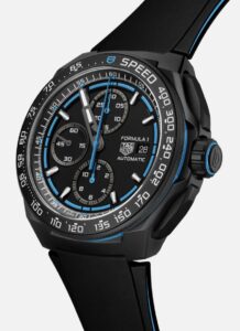 グレード2チタン製の44mmケースを採用し、ブラックDLCコーティングが施されています。ブラックオパーリンダイヤルにブルーのアクセントが加えられ、夜間のグランプリをイメージさせるデザインとなっています。ラバーストラップもブラックとブルーのバイカラーで、スタイリッシュな印象を与えます。