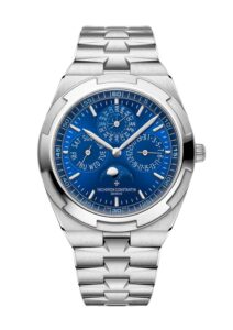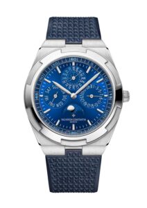Vacheron Constantin Overseas Perpetual Calendar Ultra‑Thin 4300V/220G‑B945 は、41.5 mm径×8.10 mm厚という薄型設計の18Kホワイトゴールドケースを採用し、パーペチュアルカレンダー機構を内蔵したモデルです。ムーブメントは自動巻きキャリバー1120/3 QP/1で、ムーンフェイズや閏年表示も含む複雑な機構を備え、40時間のパワーリザーブ 。ストラップはホワイトゴールド、ラバー、カーフレザーの3種を取り替え可能 。