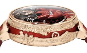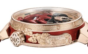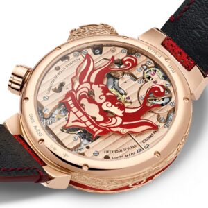 さらに、ケースバックには妖怪を描いた赤い漆が施されており、時計の裏側までもがひとつのキャンバスとなっています。ムーブメントの美しい装飾とともに、まさに「見せるための裏蓋」と言える芸術作品です。