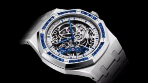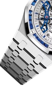 このモデルは、18Kホワイトゴールド製のケースとブレスレットを採用し、ベゼルには32個(約3.19カラット)のバゲットカット・ブルーサファイアがセットされています。ダイヤルはロジウムトーンのオープンワークで、ブルーのバランスホイールブリッジと針が特徴的です。視覚的な美しさと技術的な精巧さが融合したデザインとなっています。