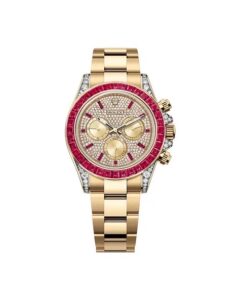 126598TRUは、18Kイエローゴールドのケースに、バゲットカットのルビーをベゼルに配した豪華なデザインが特徴です。ダイヤルはパヴェダイヤルで、無数のダイヤモンドが敷き詰められており、時字にもルビーが使用されています。この組み合わせにより、華やかさとエレガンスを兼ね備えた外観となっています。オイスターブレスレットも同じく18Kイエローゴールド製で、全体の統一感を高めています。