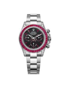 126599TRUは、18Kホワイトゴールドのケースに、バゲットカットのルビーをベゼルに配したモデルです。ダイヤルはブラックラッカー仕上げで、時字にもルビーが使用されています。このコントラストが、シックでありながら華やかな印象を与えます。ブレスレットも同じく18Kホワイトゴールド製で、全体の高級感を引き立てています。