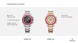 126598TRUは、イエローゴールドとパヴェダイヤル、ルビーベゼルの組み合わせにより、華やかでゴージャスな印象を与えます。一方、126599TRUは、ホワイトゴールドとブラックラッカーダイヤル、ルビーベゼルの組み合わせで、シックで洗練された印象です。好みに応じて、華やかさを求めるなら126598TRU、落ち着いた高級感を求めるなら126599TRUがおすすめです。