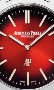 16202XTの文字盤は、深みのあるスモークバ―ガンディ。中心から外周に向かって濃淡が変化するグラデーションが施されており、光の加減によって異なる表情を楽しむことができます。インデックスや針にはピンクゴールドが使用され、ダイヤルとの統一感を高めながらも、上品なアクセントとして機能します。控えめながら個性的なこのデザインは、ビジネスからカジュアルまで幅広いスタイルに適応します。