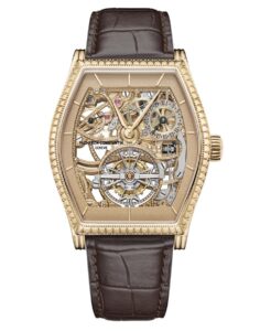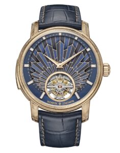 「レ・キャビノティエ・ミニットリピーター・トゥールビヨン – アールデコ様式への賛辞」特に、ニューヨークのクライスラービルに代表される幾何学的デザインを取り入れています。文字盤には、木工のマルケトリー技法を用いて、梨の木とユリノキの110枚の小さな木片を組み合わせた放射状のパターンが描かれています。さらに、シャンルベ・エナメル技法とバカットゲットダイヤモンドの設定により、ビルディングの躍動感と輝きを表現しています。