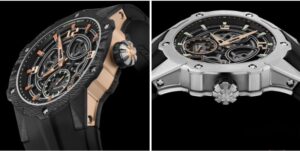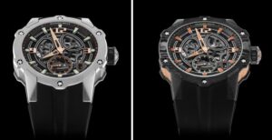 文字盤はスケルトン構造で、18K 5Nレッドゴールド製インデックスがチタン製レール上に立体的に浮かぶ構造です。視認性を重視したシャークトゥース型針と調和し、美しさと実用性を兼備します。