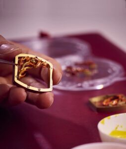 このモデルのもう一つの特徴は、「グラン・フー・エナメル」と呼ばれる伝統的なエナメル技法です。この技法では、金属のダイヤルに酸化物を用いて絵柄を描き、800〜900℃の高温で何度も焼成します。その後、透明なラッカーを何層にも重ねて焼成し、深みのある色彩と光沢を実現しています。このような手間と技術を要する工程により、RM 26-02は芸術性と技術力を兼ね備えた時計として高く評価されています。