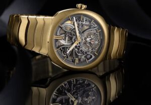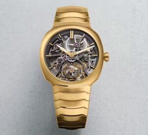 「ストリームライナー・トゥールビヨン スケルトン ブティックエディション」は、40mmのクッション型ケースと一体型ブレスレットを18Kイエローゴールドで統一しています。このデザインは、1920年代の自動車や列車の流線形デザインからインスピレーションを受けており、現代的なエレガンスとレトロな魅力を兼ね備えています。ケースの厚さは12.1mmで、ドーム型のサファイアクリスタルが装備されています。ブレスレットは、手首に自然にフィットするよう設計されており、快適な着用感を提供します。