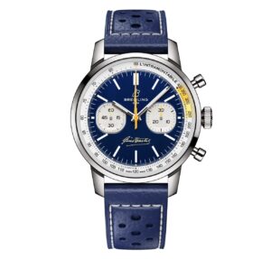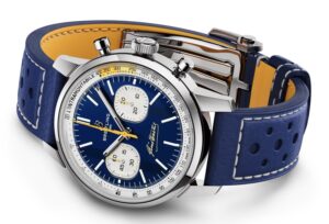 本モデルの最大の特徴は、ジーノ・バルタリのレーシングカラーであるブルーとイエローの配色が全面に採用されている点です。鮮やかなブルーのダイヤルに、ホワイトのサブダイヤル(インダイヤル)を配置し、随所にイエローのアクセントが加えられています。