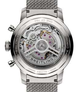 ムーブメントには、ブライトリング自社製のフラッグシップである「キャリバーB01」を搭載。COSC認定の高精度クロノメーターで、パワーリザーブは約70時間。スムーズなクロノグラフ操作と耐久性に優れた信頼性を兼ね備えています。