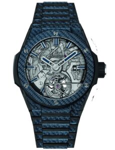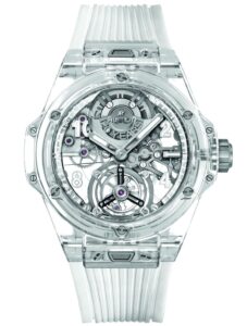 海を思わせるウォーターブルーのサファイアクリスタルケースに、モノプッシャークロノグラフとトゥールビヨンを備えた手巻きムーブメント(Cal.HUB6310)を搭載。パワーリザーブは約115時間。