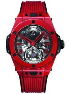 ウブロ独自のレッドセラミックケースに、自動巻きトゥールビヨンムーブメント(Cal.HUB6035)を搭載。鮮やかな赤が印象的なモデルです。