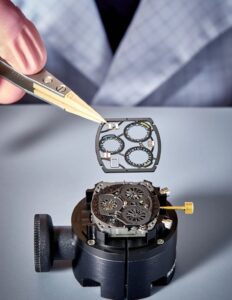 本モデルには、リシャール・ミル初の自社開発フライバッククロノグラフムーブメント「CRMC1」が搭載されています。このムーブメントは、特許取得済みのダブルオシレーティングピニオンクラッチ機構を採用し、クロノグラフ作動時でもベースムーブメントの精度に影響を与えません。また、約50時間のパワーリザーブを備え、時・分・秒・日付表示に加え、フライバッククロノグラフ機能を搭載しています。