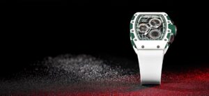 本モデルは、ホワイトとグリーンのQuartz TPT®素材を使用したケースを採用し、サイズは38.4mm x 47.34mm x 11.68mmです。スケルトン仕様のダイヤルには、ル・マン クラシックのロゴやレースのスタート時間を示す「16」の赤いインデックスが配置され、視覚的にも魅力的なデザインとなっています。また、ホワイトのラバーストラップやグリーンのリューズなど、細部にまでこだわったデザインが施されています。ムーブメントには、CRMC1を搭載し、約50時間のパワーリザーブを備えています。このモデルは、世界限定150本で製造され、価格は約335,000ドル(約4,850万円)と高額ながら、その希少性と技術的な魅力から高い評価を受けています。