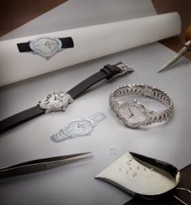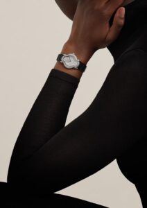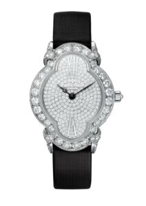 「日常をファッションとして楽しむ」をコンセプトに、ブラックのサテンストラップとアリゲーターレザーストラップが付属し、シーンに応じた着け替えが可能です。楕円フォルムは女性の手首にしなやかにフィットし、ダイヤが煌めく構成はジュエリーウォッチとして圧倒的な存在感を放ちます。