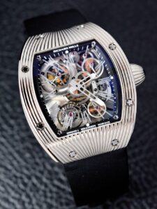RM018は2008年、パリの名門ジュエラー・Boucheronの150周年を祝して誕生しました。わずか30本限定、ホワイトゴールドケースに天然石(ラピスラズリ、タイガーアイなど)をムーブメントのホイールにセットしています 。