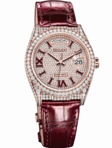 「128155RBR」はDay‑Date 36のロレックスEverose(ローズゴールド)モデルで、ダイヤルとベゼルのダイヤモンド装飾に加え、ボルドーまたはシルバーカラーのクロコダイルストラップを採用しています。