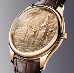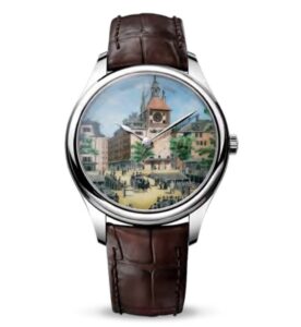 ダイヤル:Jean DuBois(1789–1849) のリトグラフを基に、Grand Feu ミニチュールエナメルで Tour de l’Île を再現。多層の透明釉薬を800°C以上で何度も焼成して表現された鮮やかで繊細な描画が特長。