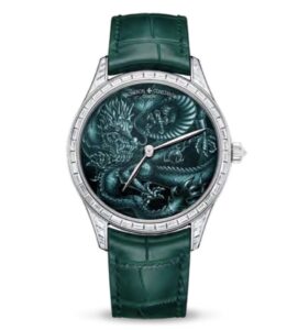 ダイヤル:グリーンのグリザイユ(grisaille)エナメルに中国の皇帝の象徴である五本爪の龍(ドラゴン)を描き出したもので、ブランド初のグリーン・グリザイユを採用 。