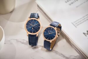文字盤はそれぞれブルー・シルバー、ストラップはアリゲーター素材で共通です。