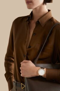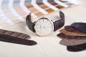 一方こちらは手巻き(Cal. 1400)搭載のドレスモデル。ケース径40 mm、厚さわずか6.79 mm。シルバートーンの文字盤に先端までシャープなゴールド針を配し、クラシックな雰囲気を醸し出します。ケースバックは無垢仕様で、所有者による刻印が可能。