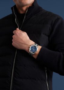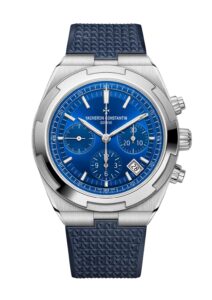 直径42.5mmのケースにラッカー仕上げのブルーダイアルを持つ「5520V/210A‑B148」は、クロノグラフと日付窓を備えたスポーティデザイン。トリプルストラップ(スチール、レザー、ラバー)と折りたたみバックルにより、スタイルのカスタマイズが可能です。