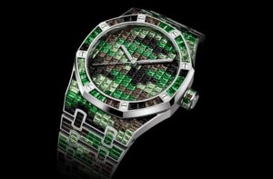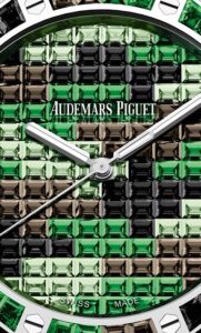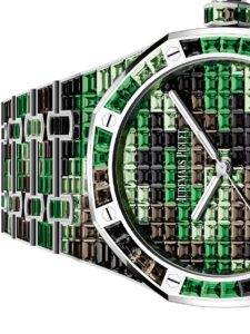 15514BC.YY.1284BC.02は、18Kホワイトゴールドのケースとブレスレットに、ブラックサファイア、ツァボライト、スモーキークォーツのバゲットカットジェムストーンを861個セッティングし、グリーンを基調としたカモフラージュパターンを表現しています。