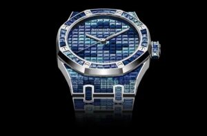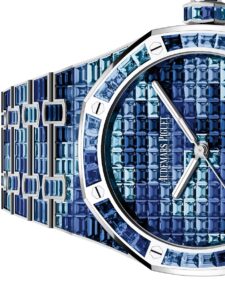 15514BC.YY.1284BC.04は、18Kホワイトゴールドのケースとブレスレットに、グラデーションブルーサファイアとスイスブルートパーズのバゲットカットジェムストーンを861個セッティングし、ブルーのカモフラージュパターンを表現しています。
