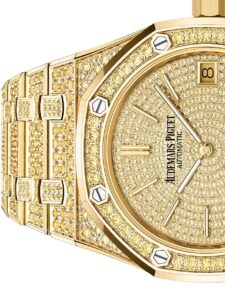 • 宝石装飾:「Fully Set」仕様として、ケース・ベゼル・ダイヤル・ブレスレットに1,528個のブリリアントカット・イエローサファイアを贅沢にすべてにセッティング(約10.4カラット相当)
